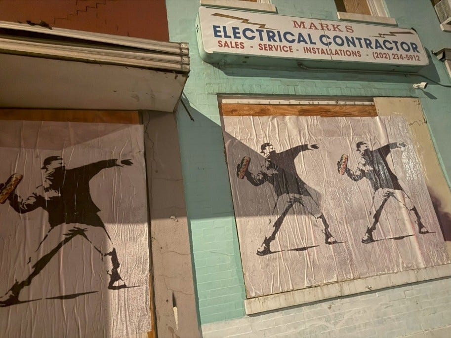 I walked down to 14th Street from U Street and saw MPD cruisers on the party corridor. There were yet more of the Banksy murals to Mr. Dunn posted on building walls. Groups of bored-looking officers had closed sections of street to create pedestrian-style corridors that looked more like Mardi Gras than a war zone. What sort of emergency is this, I wonder, that holds space for revelers?