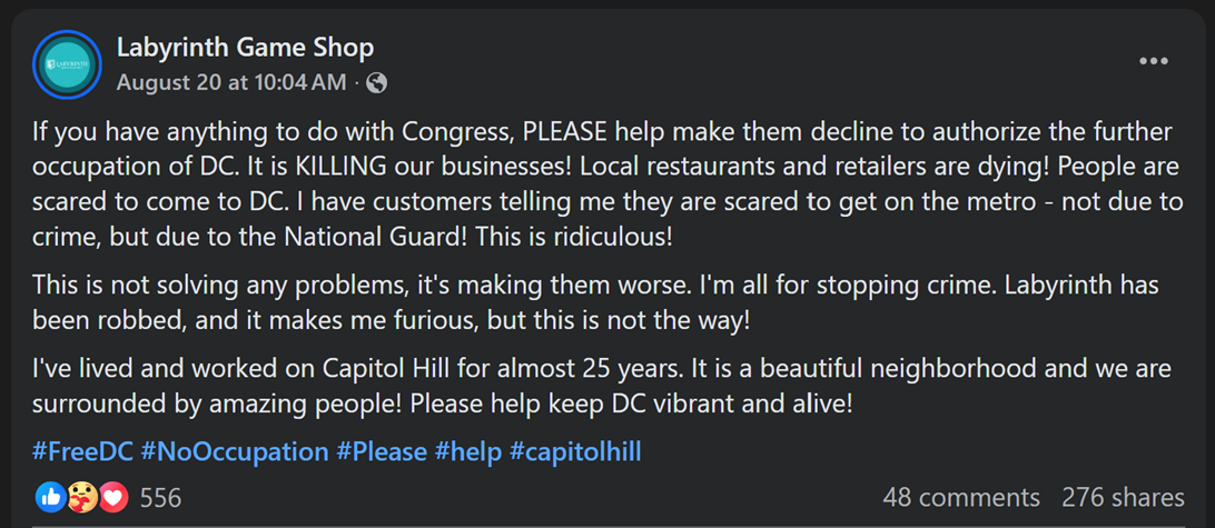 Similarly, Labyrinth Games & Puzzles, a puzzle, tabletop and Magic: The Gathering store near Capitol Hill, begged anybody with “pull” with Congress to make this shit stop and warned customers that the occupation was “KILLING [] businesses…. This is not solving any problems, it’s making them worse,” adding that people were scared to come into the city not because of crime, but because of the National Guard. This should not be surprising: Few people are willing to commute to a city patrolled by the military and with a declared “state of emergency” just to roll dice.