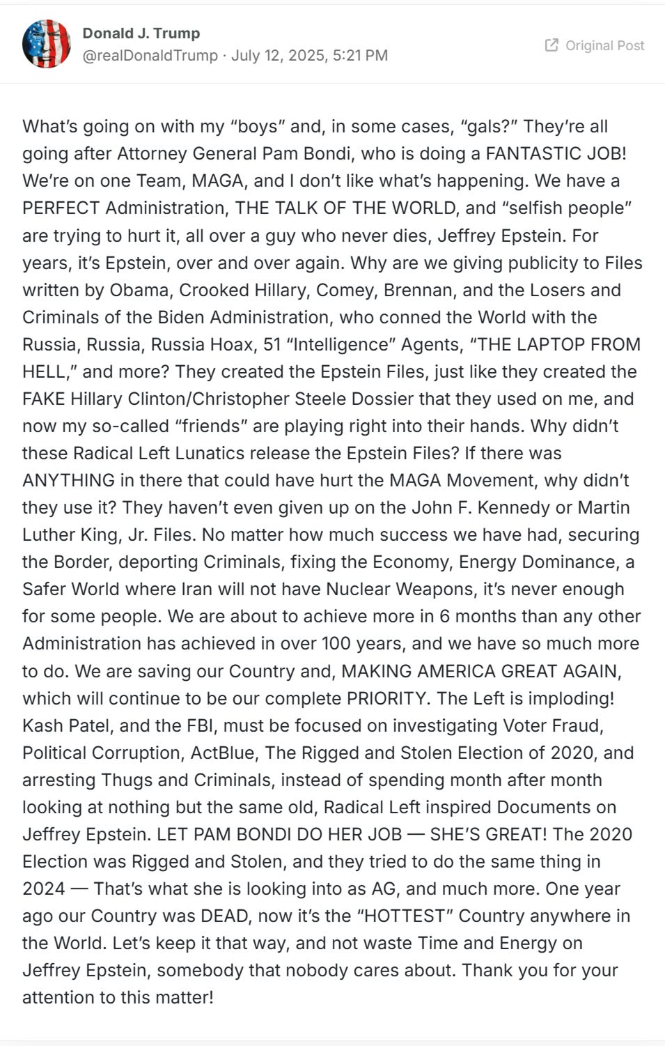 “Why are we giving publicity to Files written by Obama, Crooked Hillary, Comey, Brennan, and the Losers and Criminals of the Biden Administration…? They created the Epstein Files, just like they created the FAKE Hillary Clinton/Christopher Steele Dossier that they used on me, and now my so-called ‘friends’ are playing right into their hands. Why didn’t these Radical Left Lunatics release the Epstein Files?”