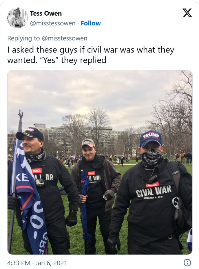 I know some percentage of my readership is employed in the dark arts of political consulting and messaging. I would encourage those Machiavellians to jot down the names of those J6 prisoners who receive clemency and set up Google alerts for those names. When one inevitably hurts someone—congratulations! We will have our own Willie Horton to hang on the neck of Mr. Trump and his every sycophant.
