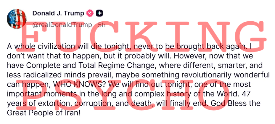 This villain posted “Praise be to Allah” on Easter Sunday—imagine if former President Barack Obama had done that. He pronounced, on Truth Social, that “Tuesday will be Power Plant Day, and Bridge Day, all wrapped up in one, in Iran.” Imagine if any other leader jerked off to fantasies of war crimes in public, on Easter morning.