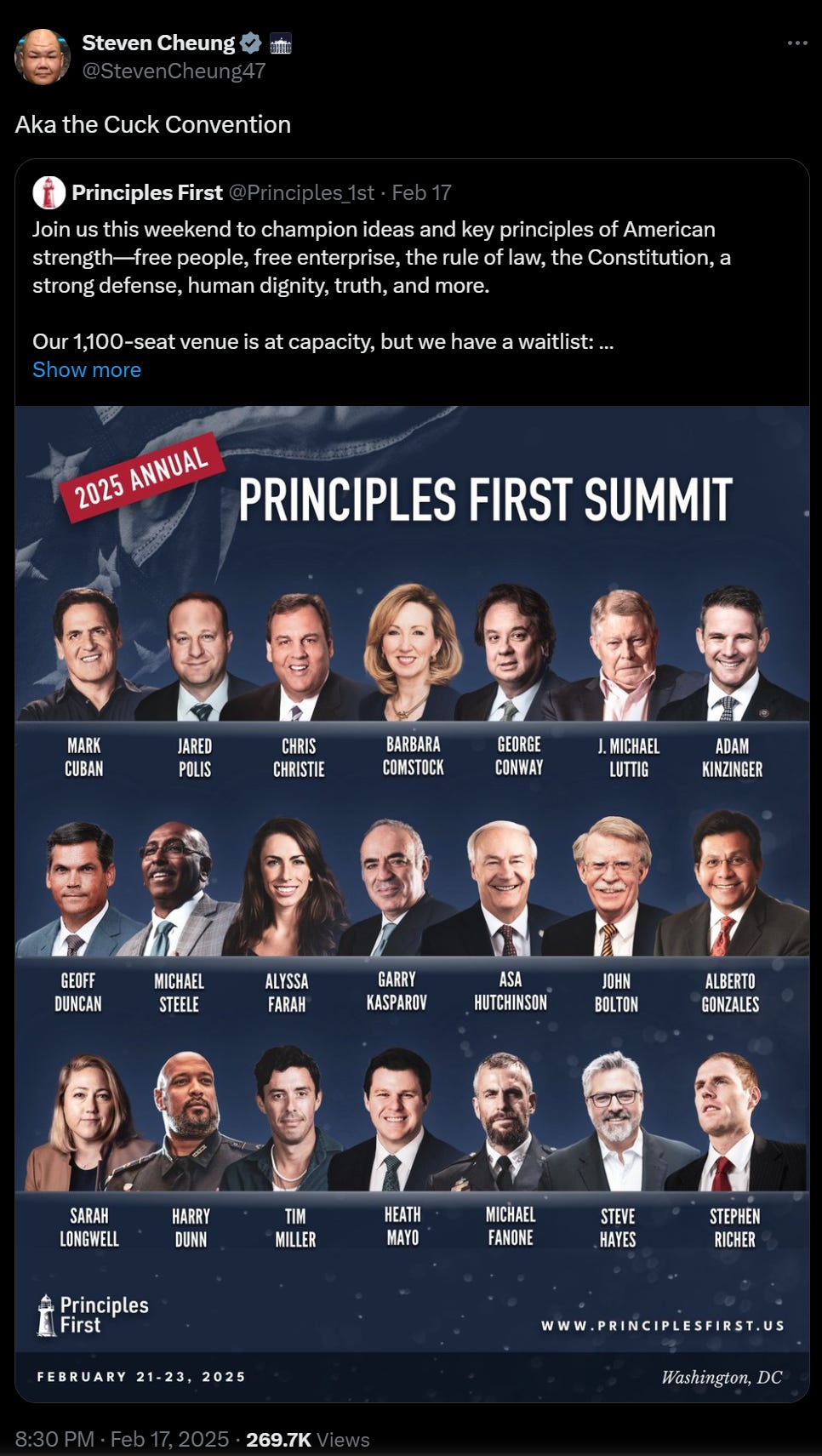 For some reason, the #NeverTrump Republican organization, Principles First, issued me a press pass to their 2025 summit in Washington, DC, on February 21-23. When I applied, my publication’s top story, “Ask not what the Democratic Party can do for you,” featured a Pikachu standing next to President John F. Kennedy while he delivered his inaugural address. Two possibilities: Principles First either did not vet me, or, more frighteningly, they did and had expectations.