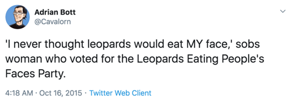 There’s a strain of political voyeurism wherein mischievous liberals microwave a bowl of popcorn so that they might enjoy watching “leopards eating faces,” a reference to this 2015 meme: