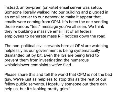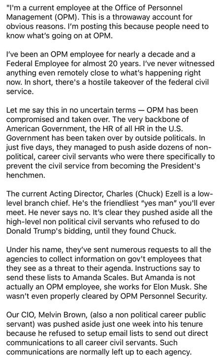 So, unqualified, untrained, inexperienced, unaccountable, unwashed, nearly-underaged interns loyal not to America but to transhumanist tech sector oligarchs have barricaded themselves away with the personal information of every federal government employee, past and present, and hooked outside servers up to that network so they can steal data and send mass e-mails demanding resignations from the entire civil service. Not good!