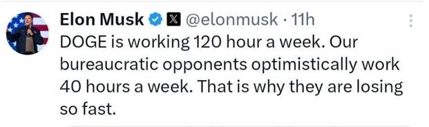 The father of twelve seemingly has extra time to harvest government data and harass federal employees in addition to running six companies, “K-holing” nightly on the dissociative horse tranquilizer ketamine, tweeting misinformation more than sixty times daily, doing Nazi salutes, and cheating at video games. This is not something the governed consented to—even Mr. Trump may not be aware of the scope of abuses happening behind his back. It could be illegal and certainly requires disclosure, oversight, and reassurance. This is a fucking coup masquerading as reform.